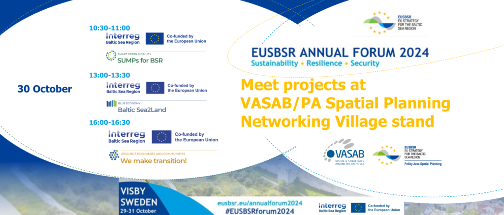 VASAB / PA Spatial Planning stand will welcome three PA Spatial Planning relevant projects to share their message in EUSBSR Annual Forum 2024 in Visby: SUMPs for BSR, Baltic Sea2Land and We make transition!