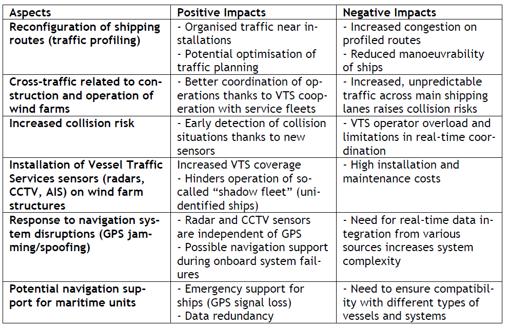 Table 1: Introduction of new VTS systems – Positive and Negative Impacts of wind farm construction on traffic safety aspects.